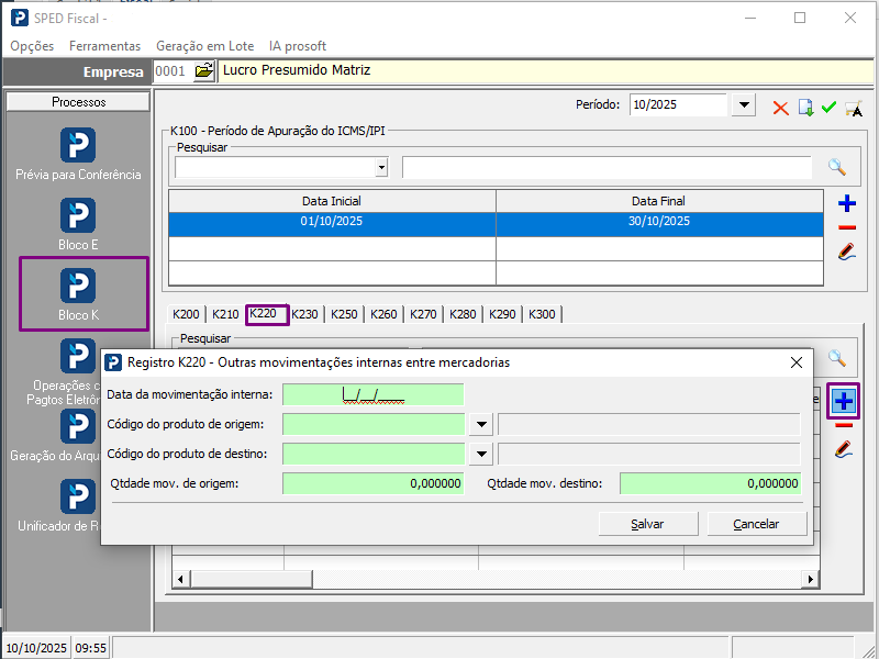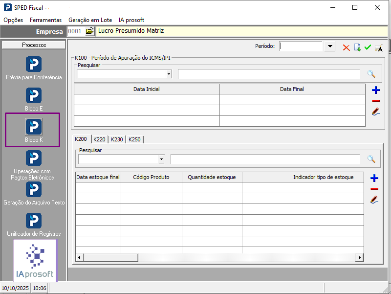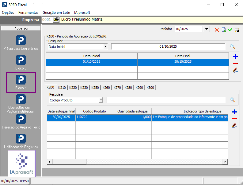 Após a importação os campos referentes aos registros do Bloco K que constarem no arquivo importado são preenchidos.
