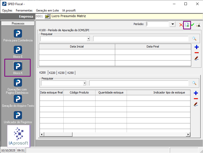 2- Na rotina de Sped Fiscal clique na Guia Bloco K e informe o período do bloco K
