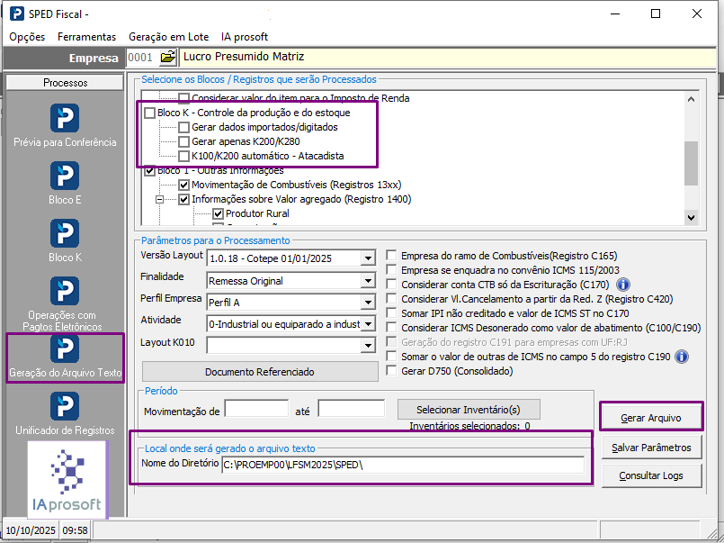 2- Selecione os blocos a serem gerados no arquivo e preencha os Parâmetros para o Processamento