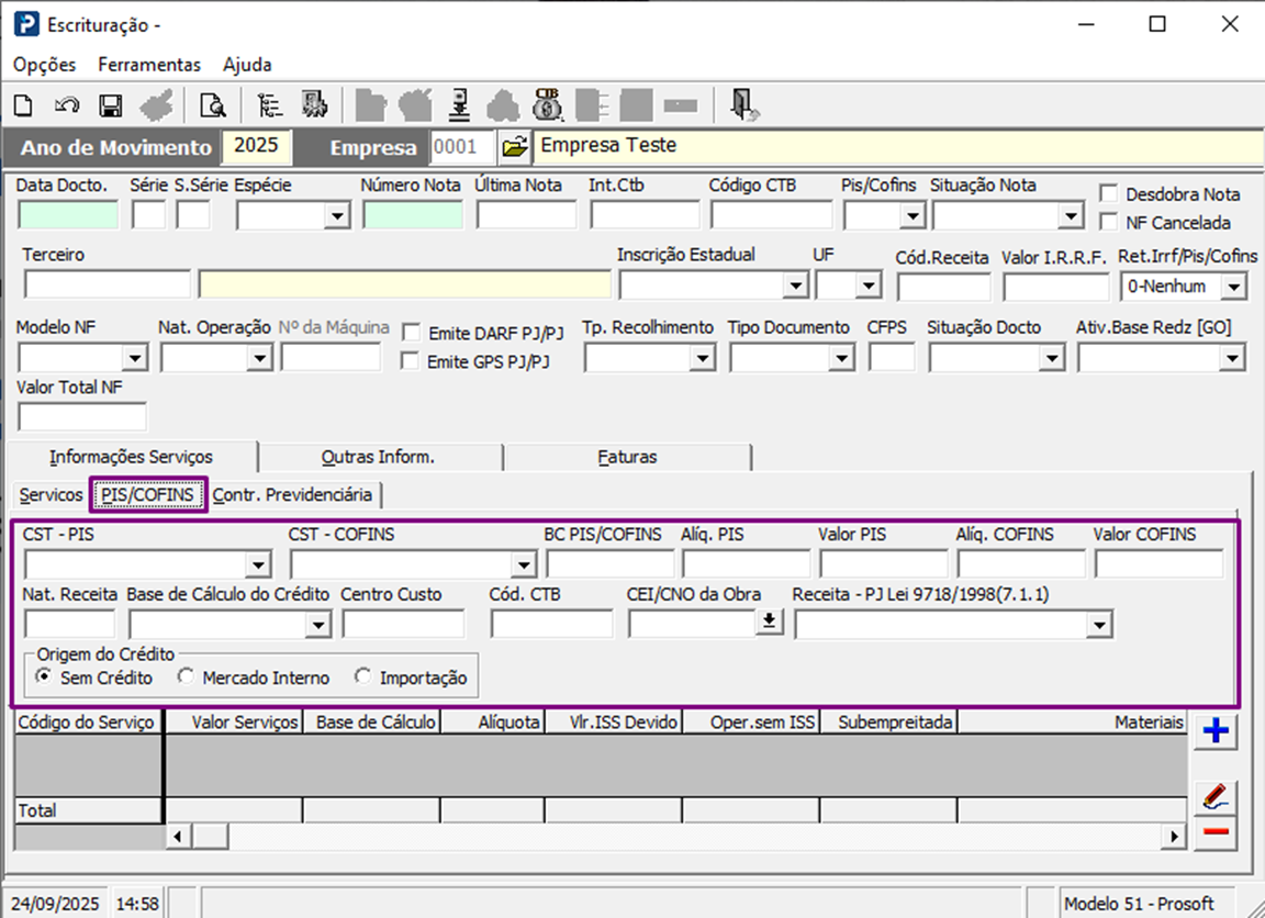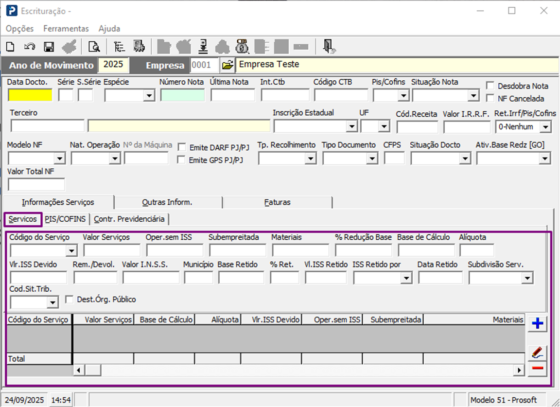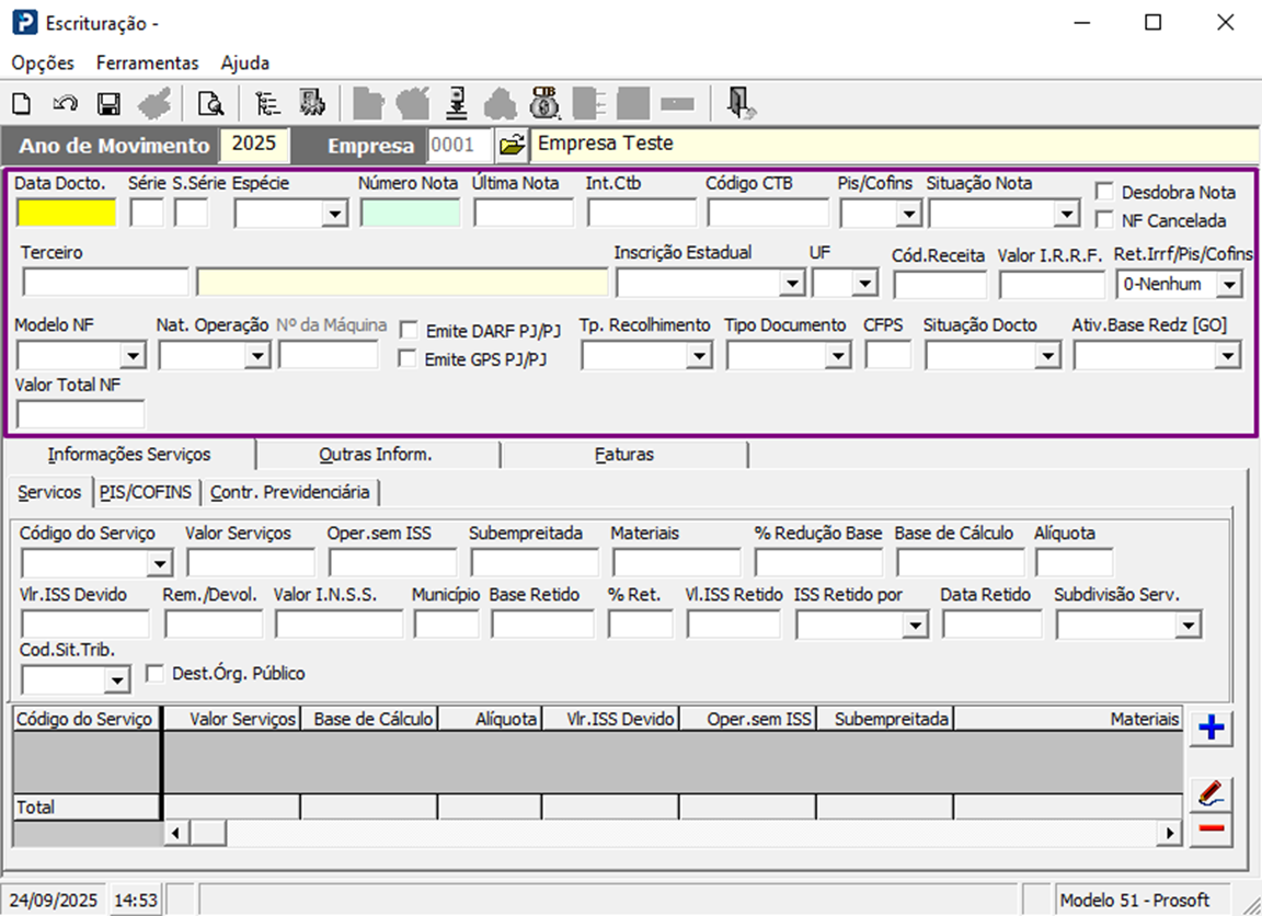 Informe a empresa e clique no template desejado para escriturar os valores, como, por exemplo, nota Modelo 51 – Prosoft.