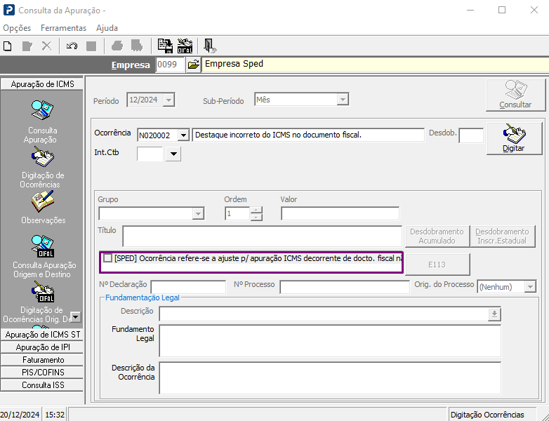 1- Acesse: Fiscal > Apuração > Consulta da Apuração > Apuração de ICMS > Digitação de Ocorrências