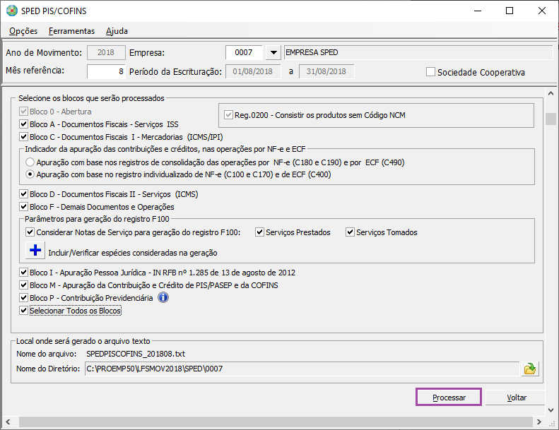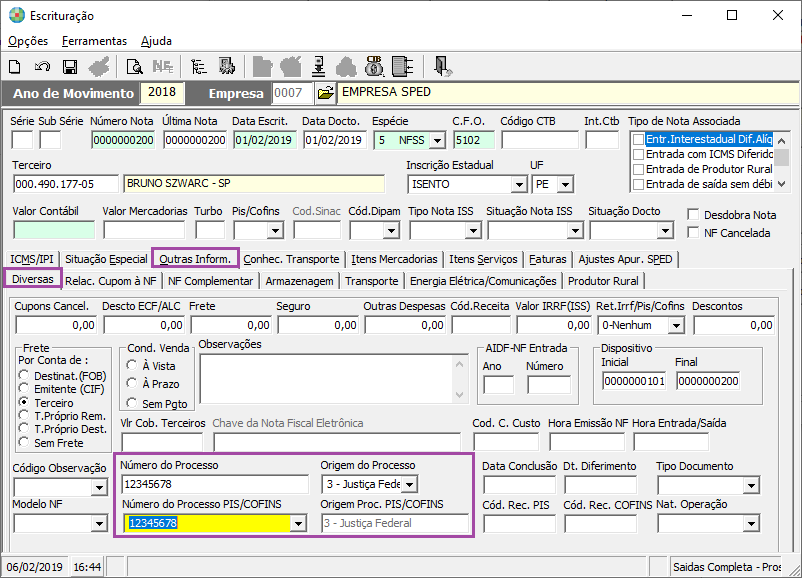 Importante: O campo número do Processo Pis/Cofins vem do cadastro efetuado no Processos Administrativos/Judiciais onde seu vínculo é no cadastro empresa levando para escrituração.