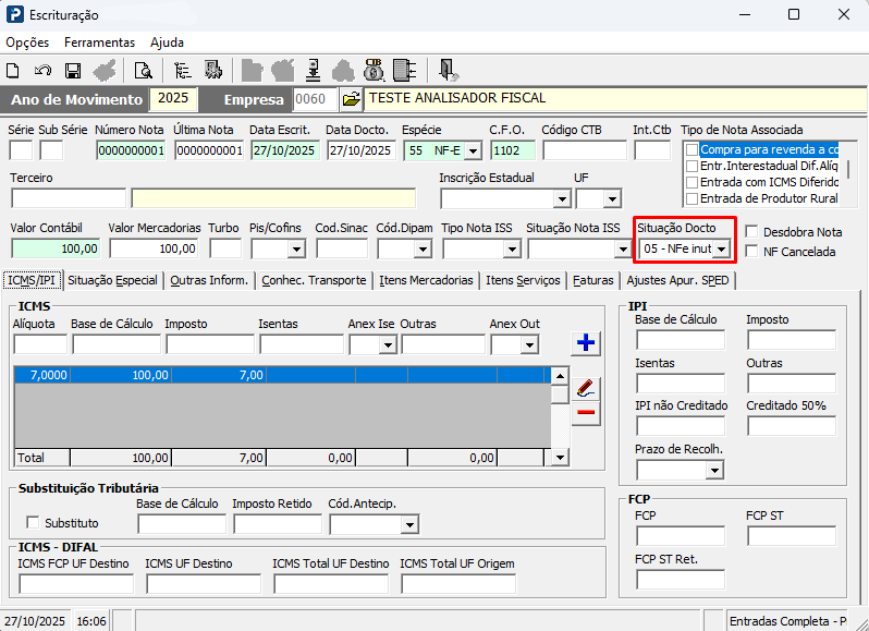 Informações Adicionais: A situação ocorre, pois na escrituração a situação do documento está informado como 05 - NFe inutilizada.