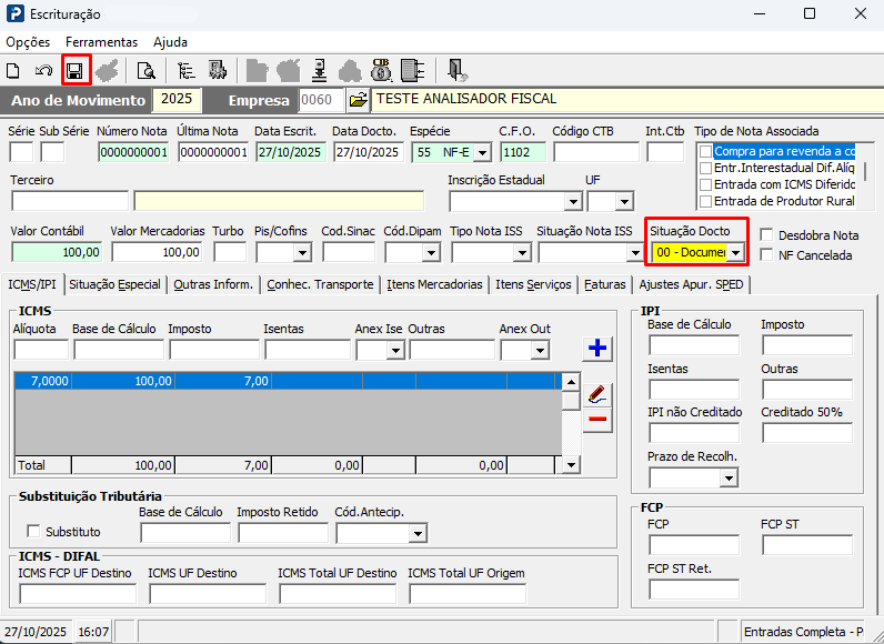 2- A situação do documento deste exemplo é regular, sendo assim informe a situação correta para 00 - Documento regular.