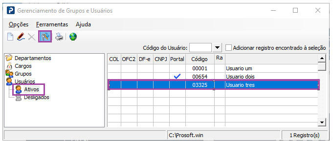 2- Clique sob o campo Ativos e localize o usuário que deseja alterar a senha