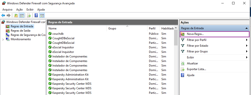 2- Para liberar portas de entrada, clique em Regras de Entrada, do lado esquerdo da tela.