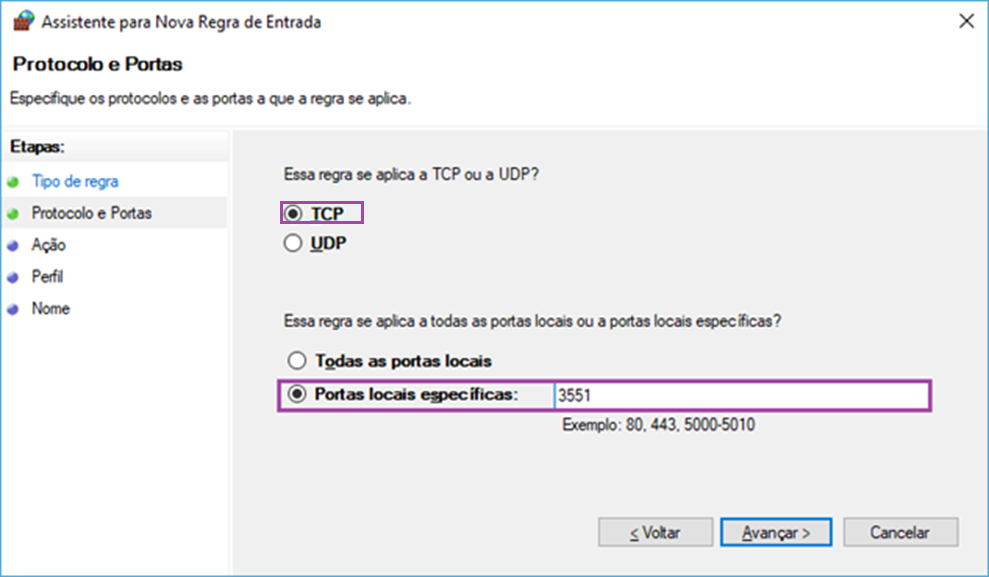 5- Selecione a opção TCP e digite as portas desejadas e clique em Avançar.