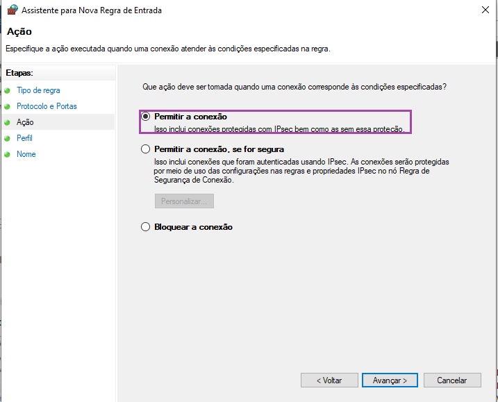 6- Selecione a opção Permitir a conexão e clique em Avançar.