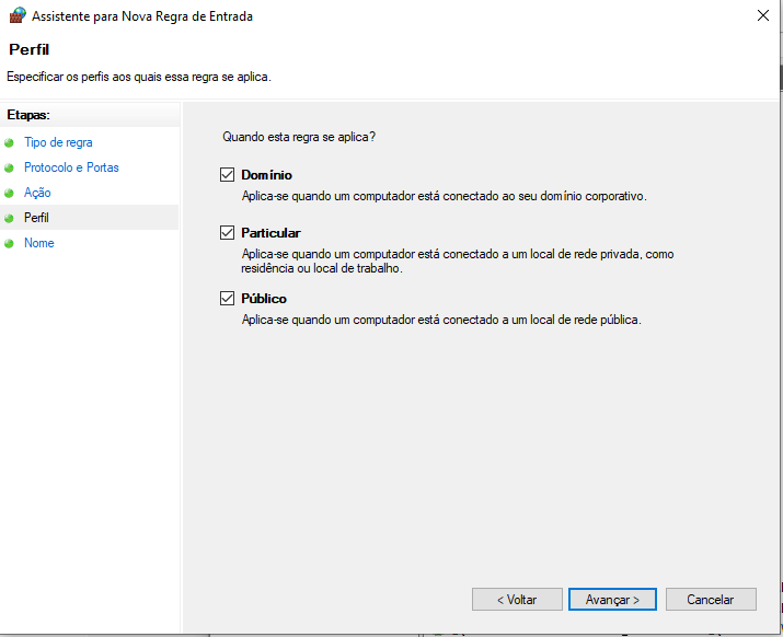 7- Deixe habilitadas as opções Domínio, Particular e Público e clique em Avançar.