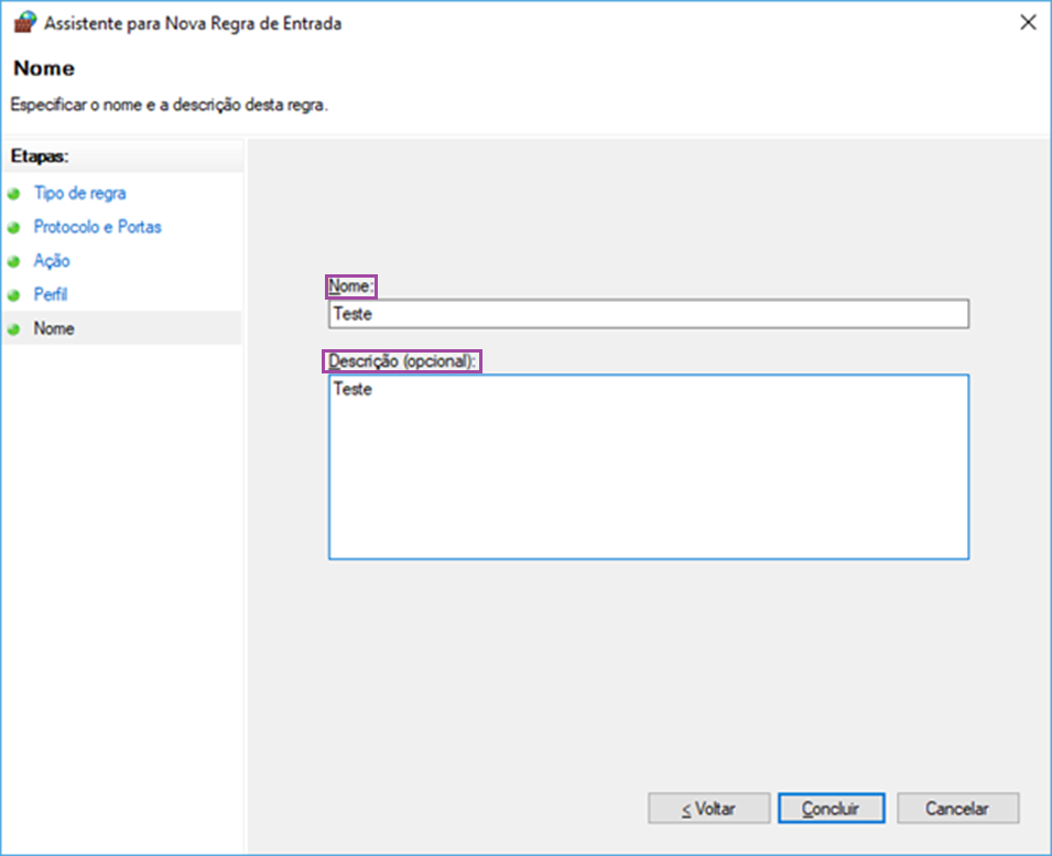 8- Informe o Nome e a Descrição da porta e clique em Concluir