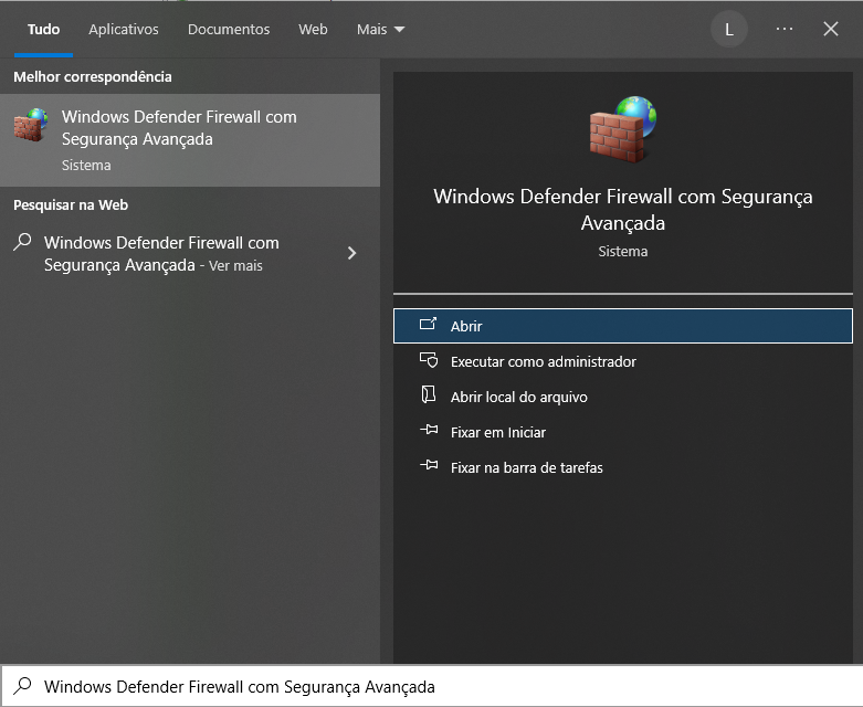 1 - Clique no botão do Windows e digite Windows Defender Firewall com Segurança Avançada.