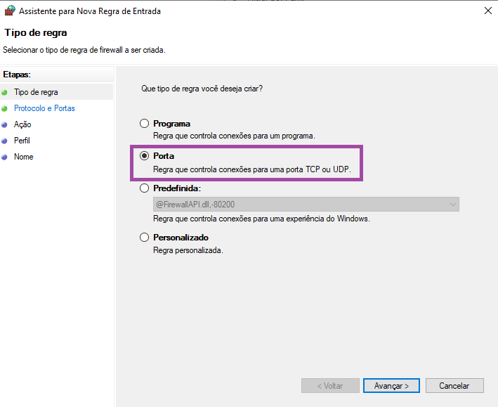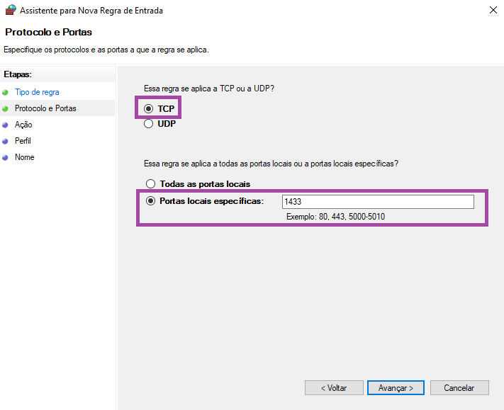5 - Selecione a opção TCP e digite as portas desejadas e clique em Avançar.