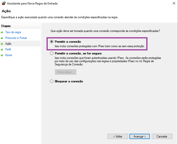 6 - Selecione a opção Permitir a conexão e clique em Avançar.