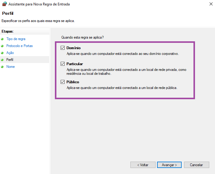 7 - Deixe habilitadas as opções Domínio, Particular e Público e clique em Avançar.