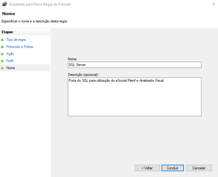 8 - Informe o Nome e a Descrição da porta e clique em Concluir
