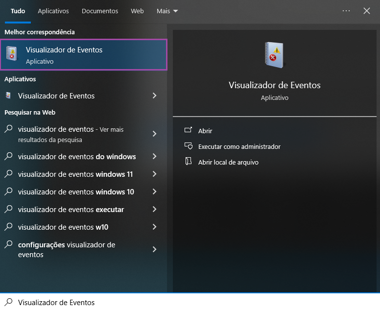 1 - Na barra de tarefas do Windows, digite "Visualizador de Eventos"