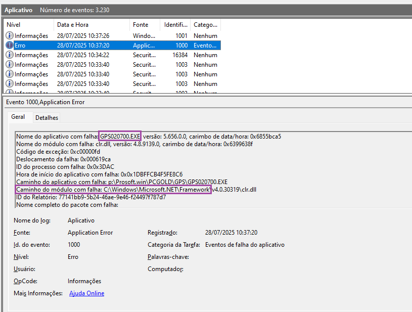 3 - Valide se existem erros nas rotinas do Prosoft, apontando o Microsoft Net Framework como causador dos erros