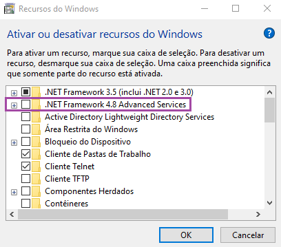 Depois de reiniciar, acesse novamente a página de ativação dos recursos do Windows para reativar o Framework 4.8