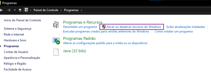 6 - Selecione a opção "Ativar ou desativar recursos do Windows"