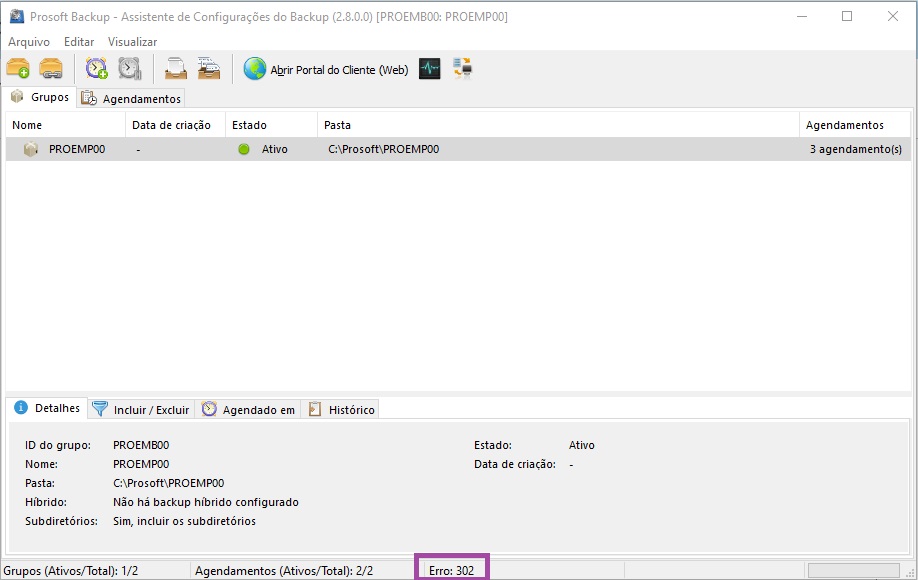 Um ou mais grupos configurados para realização do backup não sobem ao portal, com código de erro 302 no Agendamento. A máquina está corretamente registrada e alguns grupos sobem ao portal (Prosoft.win, SQL), mas os grupos com as pastas de maior volume (PROEMPXX) não são concluídos com sucesso.