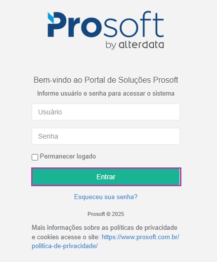 1-Acesse o Portal de Soluções e efetue o login: https://portal.prosoft.com.br/