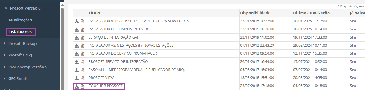 2. No portal, acesse: Downloads > Instaladores e localize o arquivo COUCHDB PROSOFT e realize o download