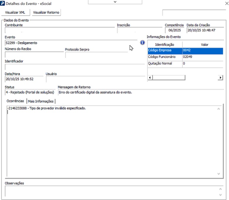 Ao enviar um evento para o esocial é retornado a mensagem: -2146233088 - Tipo de provedor inválido especificado no retorno do evento do Esocial com o Status 4. (Certificado A3)