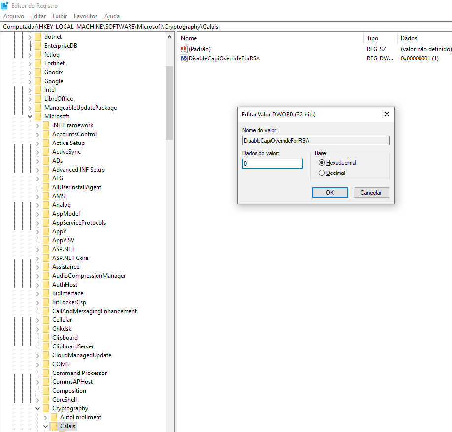 - Dentro de Calais, dê um duplo clique em DisableCapiOverrideForRSA