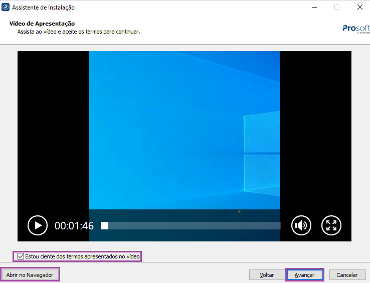 Será apresentado o Vídeo de Apresentação com informações importantes sobre o processo. O vídeo pode ser assistido na própria janela do instalador ou por meio do navegador clicando no botão Abrir Navegador.