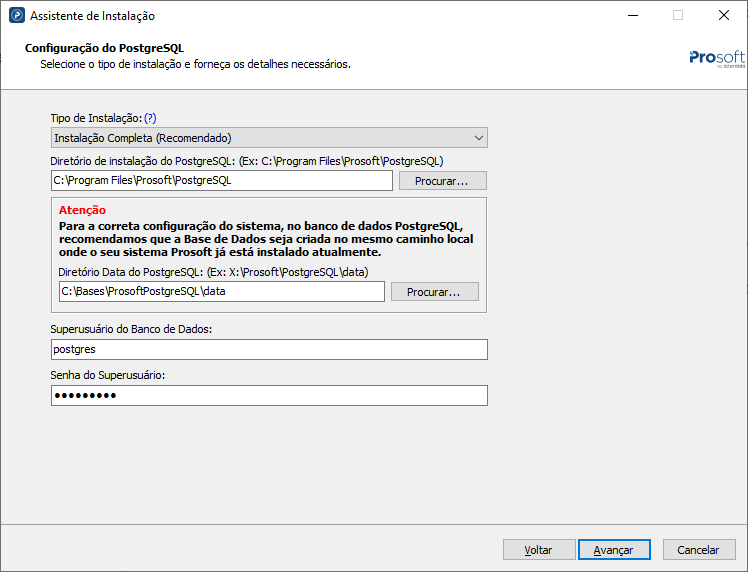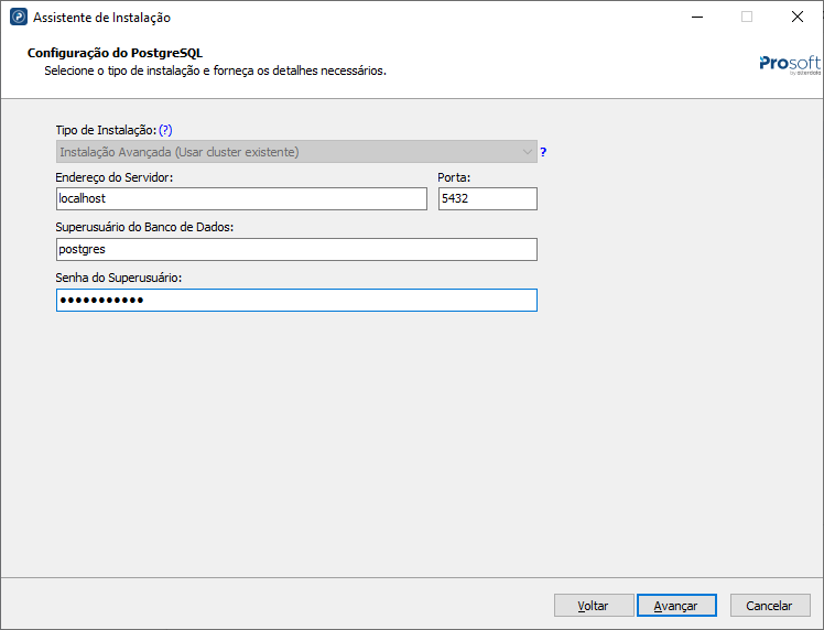 Senha do Superusuário: Usada para acessar a conta principal do PostgreSQL. Deve ser guardada em local seguro, pois dá acesso total ao banco de dados. A Prosoft não armazena essa senha, sendo de total responsabilidade do cliente o armazenamento seguro dela.