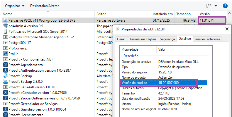 As versões deveriam estar idênticas. Como pode ser visto nas imagens, as versões estão diferentes, onde a versão instalada é a 15.21.003 e o sistema Prosoft está fazendo a leitura da versão 11.31 do Pervasive.