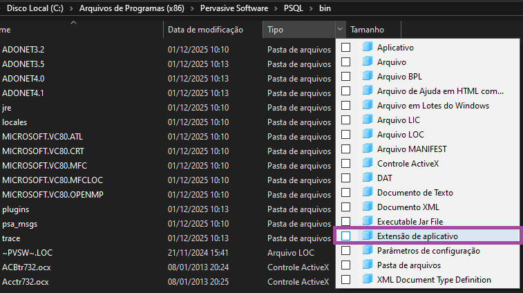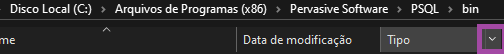 5 - Para correção, acesse C:\Program Files (x86)\Pervasive Software\PSQL\bin. Clique na seta de "Tipo". Será aberto um menu suspenso.