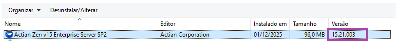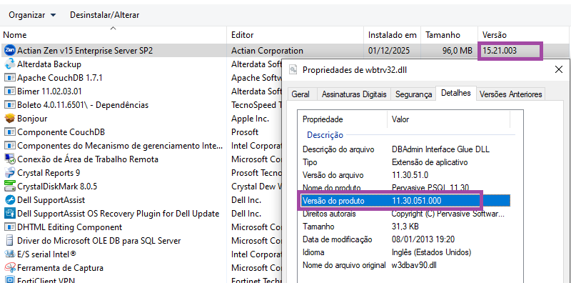 Actian Zen 15 instalado e sistema lendo a versão 11: