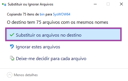 8 - Acesse C:\Windows\SysWOW64 e cole os arquivos copiados no passo anterior. Se algum arquivo apresentar a mensagem de que já existe, clique em "Substituir os arquivos no destino".