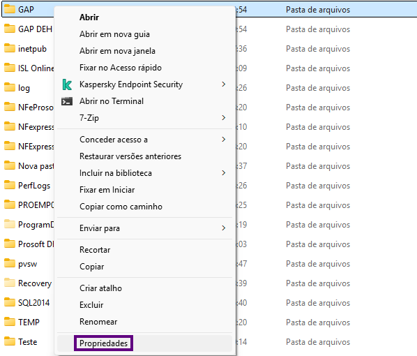 1 - Clique com botão direto sobre a pasta que deseja dar permissão, e selecione propriedades.