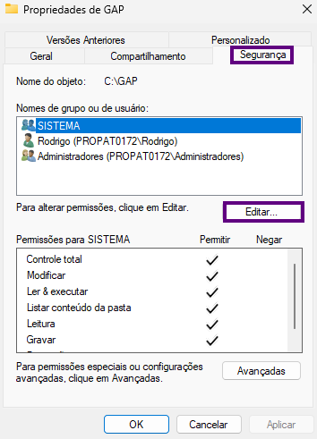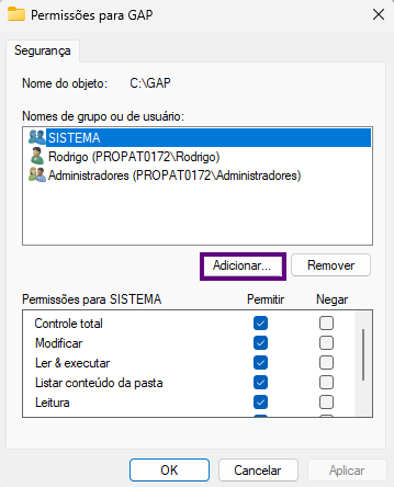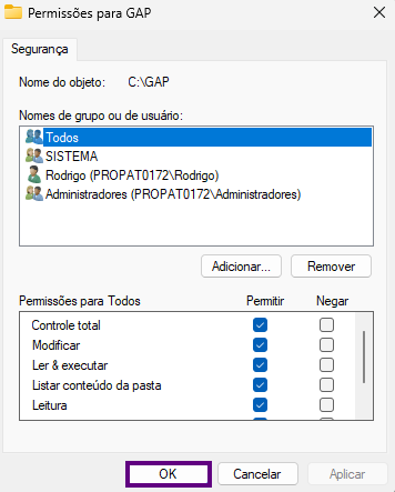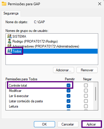 6 - Seleciona todos, em controle total coloque permitir e após isso selecione aplicar.