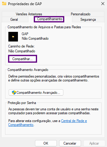 2 - Na aba Compartilhamento selecione a opção compartilhar.