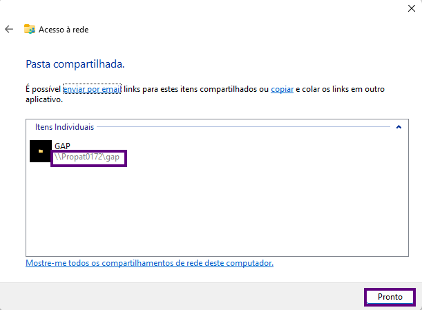 6 - O caminho de rede será exibido. Após anotá-lo, você pode selecionar "Pronto".