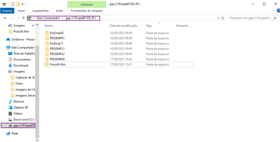 4 - Localize a unidade de mapeamento Prosoft. No exemplo, a pasta GAP está mapeada em P com os arquivos da Prosoft.win e Proemp