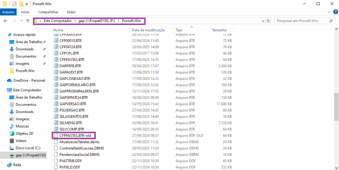 5 - Acesse: ?\Prosoft.win, localize e renomeie o arquivo CFPPASTAS.BTR para CFPPASTAS.BTR-old.