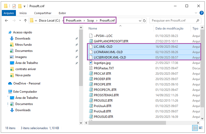 2- Acesse a pasta ?: > Prosoft.Win> Scop > Prosoft.cnf localize os arquivos lic.xml, licparam.xml e licservidor.xml e renomeie para lic.xml-old, licparam.xml-old e licservidor.xml-old