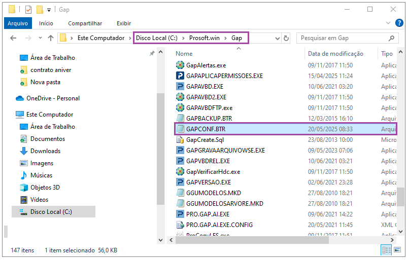 1- Acesse ?: > Prosoft.Win > GAP e localize o arquivo GAPCONF.BTR remova o arquivo para GAPCONF.BTR.