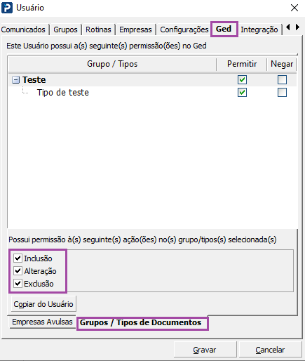 3- Na aba GED > Grupos / Tipos de Documentos, marque as três permissões Inclusão, Alteração e Exclusão e depois clique em Gravar.
