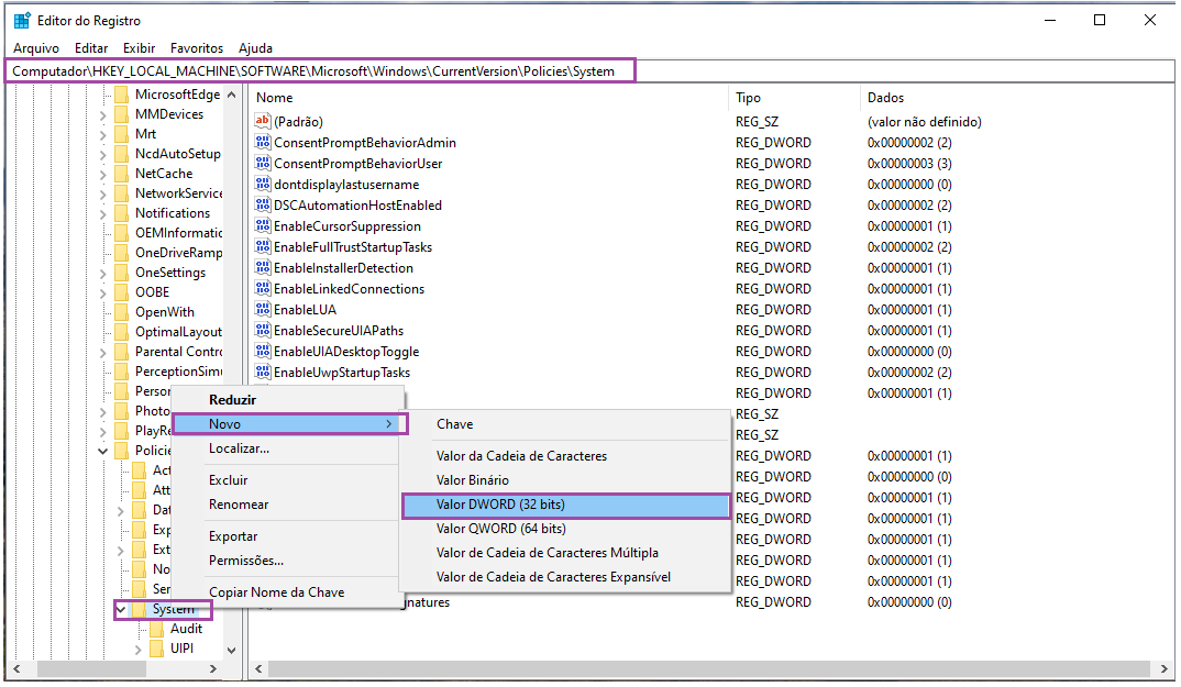 4. Clique com o botão direito em cima de System > Novo > Valor DWORD (32 bits)