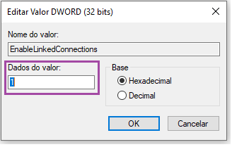 5. Digite no nome do novo valor EnableLinkedConnections