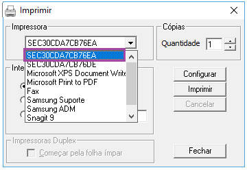 - No exemplo usamos a impressora denominada Impressora SEC30CDA7CB76EA, que na realidade não existe, mas está aparecendo na lista de impressoras disponíveis.