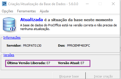 Quando a Versão Atual é igual a Última Versão Liberada significa que a Base está na última versão do sistema.