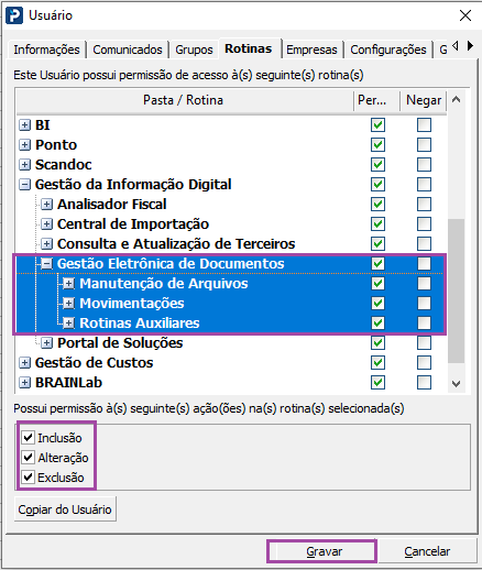 3- Acesse a guia rotinas no cadastro do usuário, e atribua permissão de inclusão, alteração e exclusão nas rotinas do módulo Gestão Eletronica de Documentos.