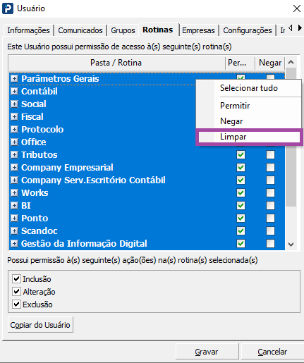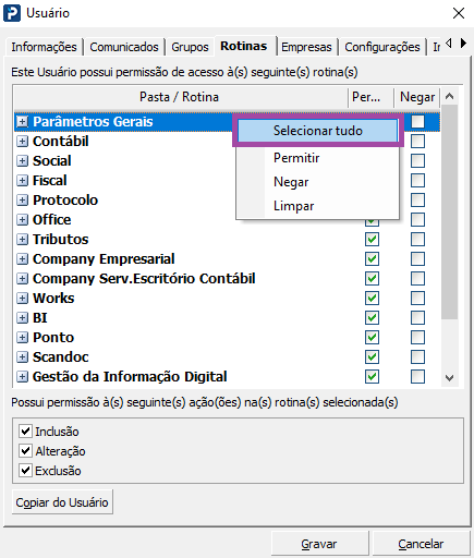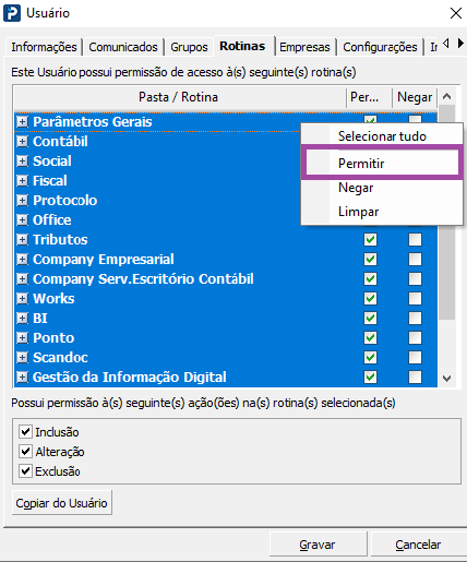 6- Abra o cadastro do usuário novamente, acesse a aba Rotinas, clique com o botão direito em cima de qualquer rotina e selecione a opção Permitir