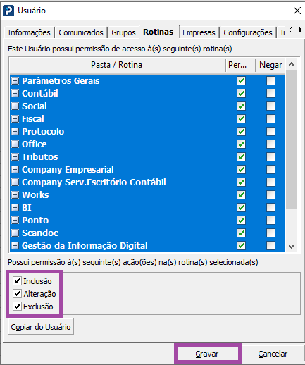 7- Habilite também as opções Inclusão, Alteração e Exclusão e clique em Gravar